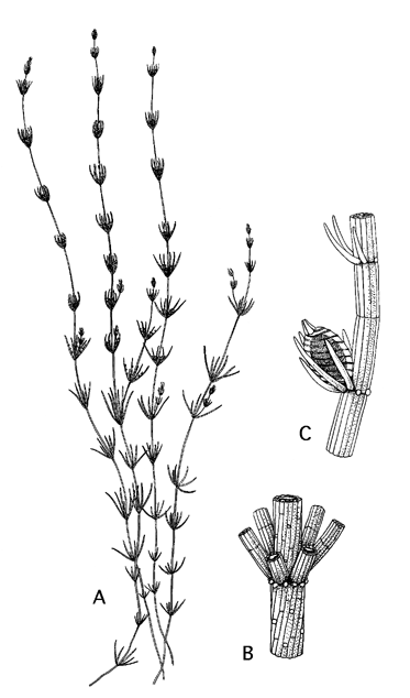 A habitus, let op de ingebogen kranstakken x 0,5, B deel van de as met een knoop en kranstakken x 20, C kranstak met oogonium x 30.